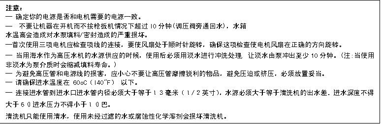 6連接電源線到3相電源。在連接電源之前,檢查電源電壓和頻率,并與銘牌相對照,如果電源合適,現(xiàn)在您可以插上插頭。清洗機必須接在有確實地線的插座上,加裝一個另外的安全斷路器(30毫安)將增加使用者的安全性